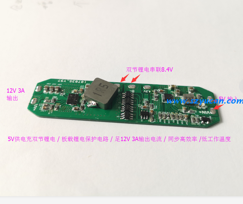 詳細信息5V輸入給雙節(jié)8.4V串聯(lián)鋰電充電+同步高效升壓輸出12V3A電源板PCBA