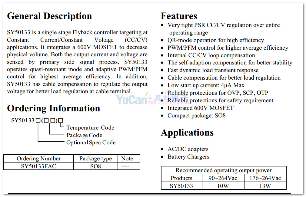 SY50133系列 恒壓輸出AC/DC產(chǎn)品,在全壓輸入的情況下,其輸出功率為10W,可以滿足5V2A、12V1A等功率級別的AC/DC產(chǎn)品