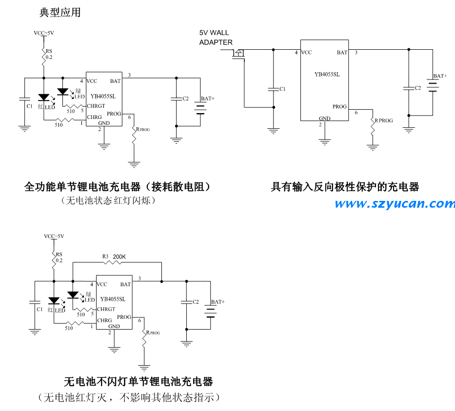 當(dāng)輸入電壓(交流適配器或USB電源)被拿掉時(shí),YB4055自動(dòng)進(jìn)入一個(gè)低電流狀態(tài),將電池漏電流降至1uA以下.YB4055的其他特點(diǎn)包括充電電流欠壓閉鎖自動(dòng)再充電和一個(gè)用于指示充電結(jié)束和輸入電壓接入的狀態(tài)引腳。