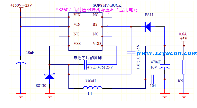YB2602集成PFM控制器及200V高雪崩能力智能功率MOSFET,用于外圍元器件極精簡的小功率非隔離開關(guān)電源,固定輸山電壓.YB2602內(nèi)置200V高壓啟動(dòng)模塊。實(shí)現(xiàn)系統(tǒng)快速啟動(dòng)、超低待機(jī)功能.該芯片提供了完整的智能化保護(hù)功能,包括過找保護(hù),欠壓保護(hù).過溫保護(hù).另外YB2602的降頻調(diào)制技術(shù)有助于改善EMI特性.